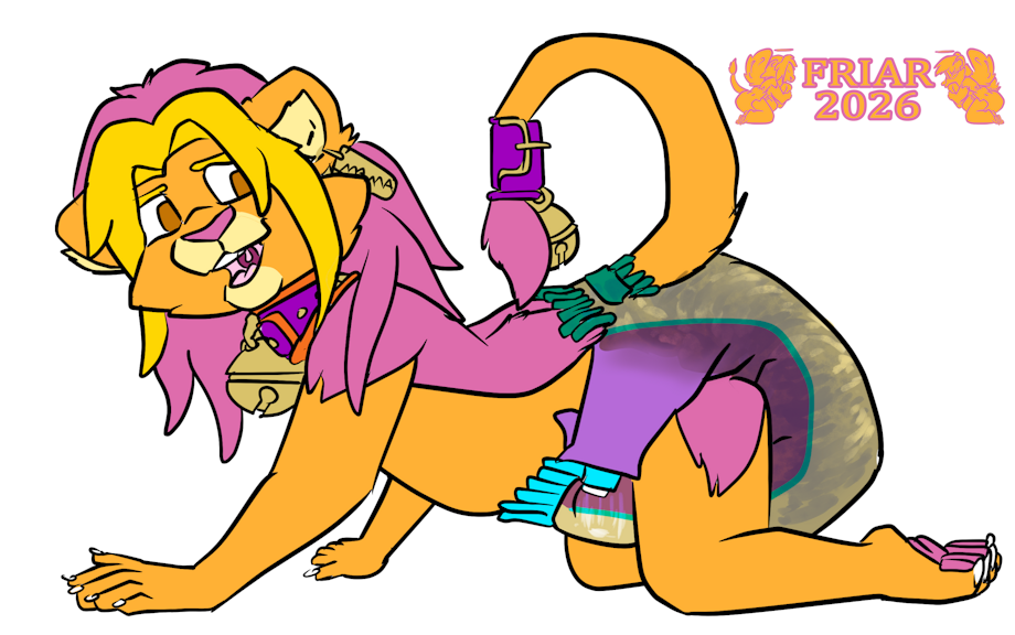 Illustration of Friar the wet and messy diapered lion posing cutely on all fours in his crib while filling his diaper. "You want me to make yuckypants? How dignified!"