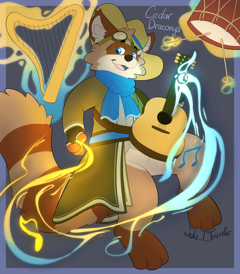 Cedar (Sɜː-dɑːr) is my raccoon bard. He's a cheerful and easygoing lad (at least he tries to be). His music is how he earned a living ever since his mother was murdered and his father went insane from that incident. It was his only friend for a very long time, and it's how he wants to spread his music so it can help them in hard times.
