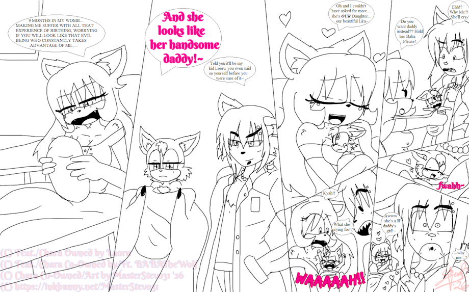 Ik I'm way late of that trend But on some social media I saw some Shadamy dub comics of them having their daughter and I remember couple years ago of hearing that meme/trend saying 9 Months in My womb. I figured what if canonically Looru felt that way with Lira but stressing and worrying if she'll come out as her rapist's image aka Stevo, but lo and behold, she looks like her daddy!~ ^^ And...just like that, Lira became a instant daddy's girl after calming down when embracing Baba ;3