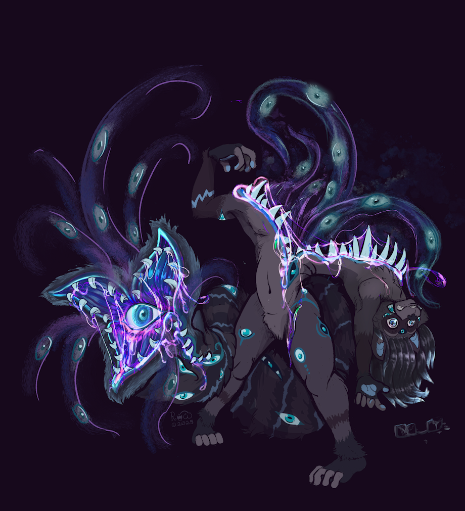 "Empty and absent, though the abyss may be. Filled with curious, searching the void can see. Many infinite, eyes observing from the dark. Abundant ichor, slithers seeking its mark. Arrays of enamel, tooth and claw gnawing, Ravenous and hungry, is it just a drawing?"