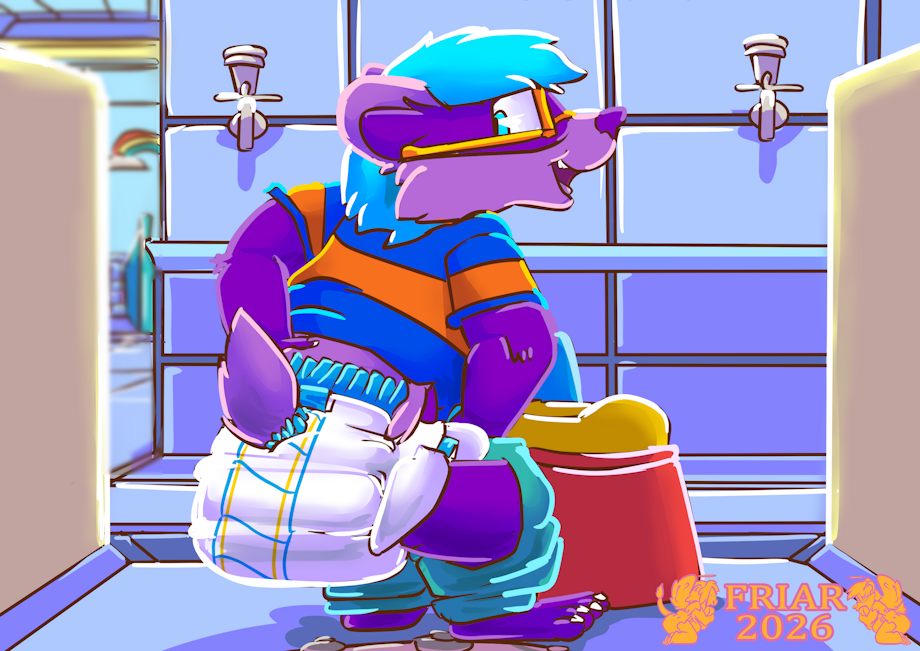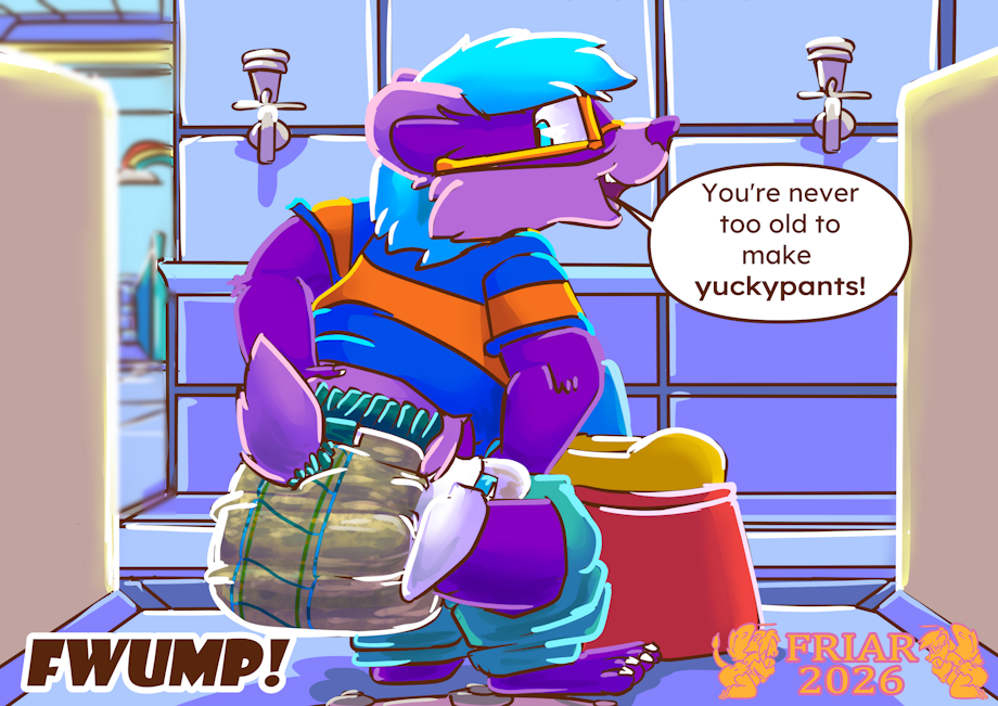 Illustration of Everett the wet and messy diapered badger lowering his teal pants and filling his diaper in front of a potty in the pushies school nursery. "You're never too old to make yuckypants!"