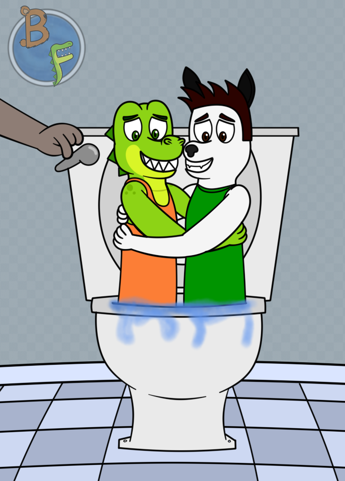 Genji and Croc are trapped inside the toilet, so someone flushes them down the toilet while they both smile sheepishly