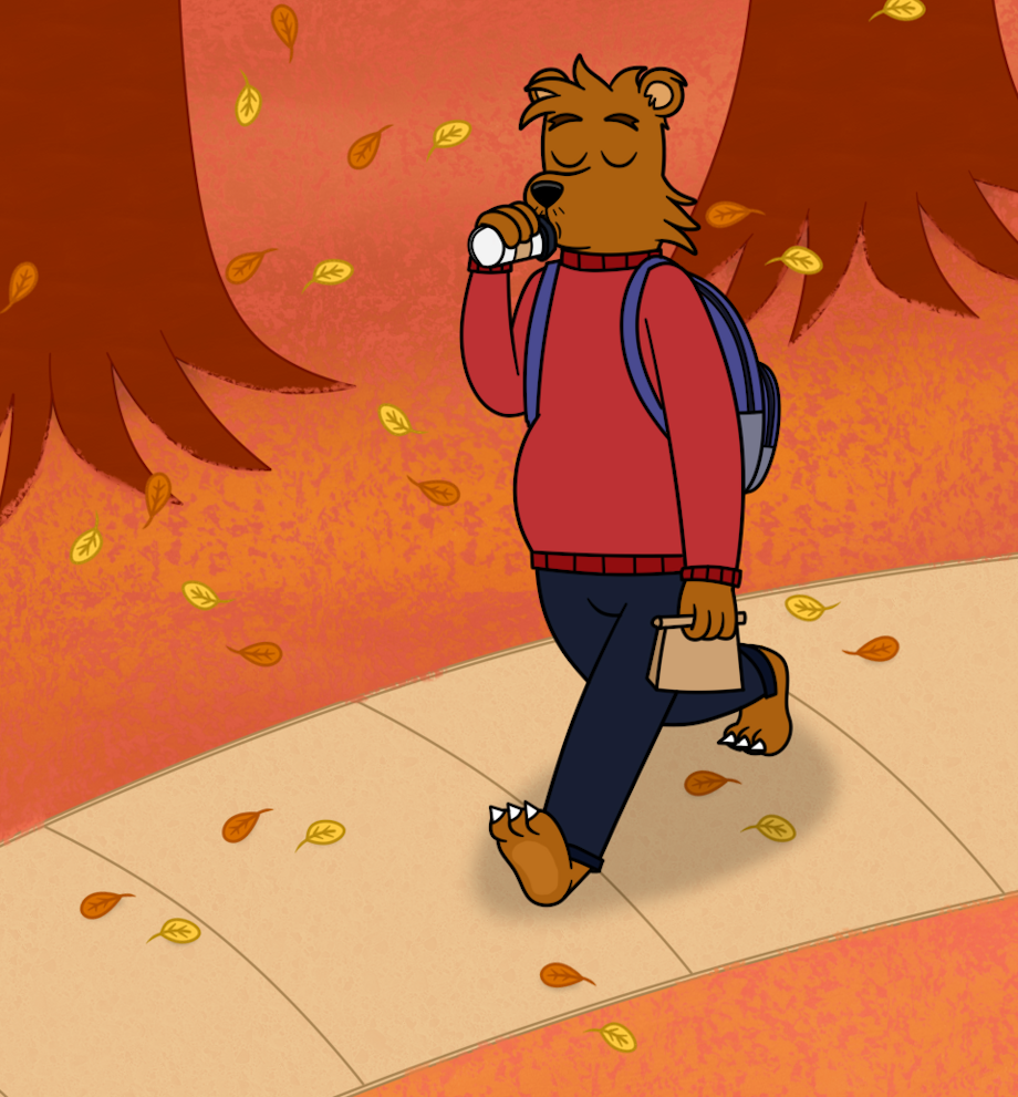 Bert is walking in a plaza with autumn leaves, drinking coffee and carrying a dessert in a small bag.