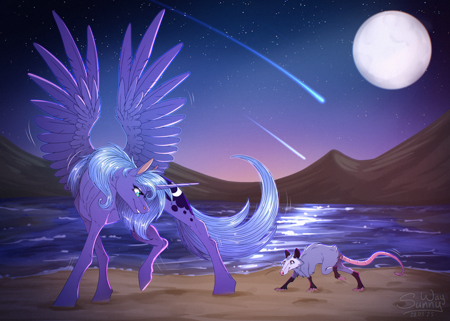 -Hi, little one. I see you like my night! Wanna be my friend? - Princess Luna asked with with trembling of the heart. Little possum happily jumps, following night pony. And a new friendship settled in their hearts. Little gift for Shaddar! ^^