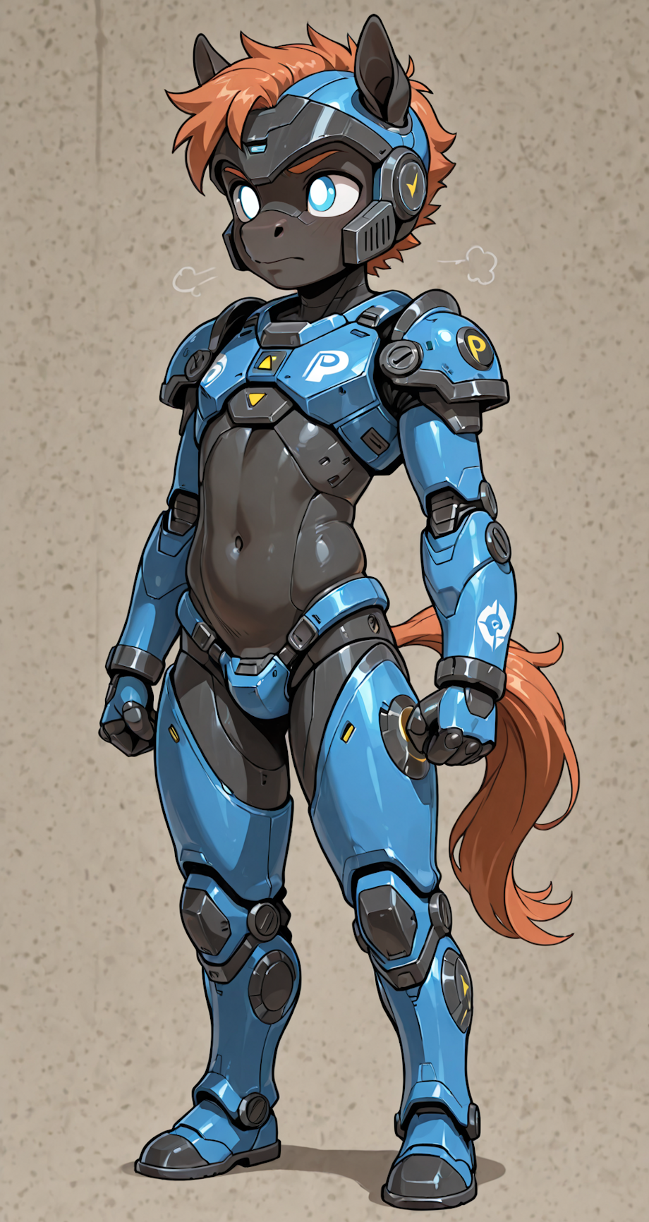 Solo, 13-year-old, young male teen, equine, shortstack petite, small body proportions, wearing power armor, detailed,.Negative prompt: no semen on legs.Steps: 128, Sampler: DPM++ 2M, Schedule type: Karras, CFG scale: 6, Seed: 2753955579, Size: 1088x2048, Model hash: a6da48b7a2, Model: novaFurryXL_ilV140, RNG: CPU, Version: classic