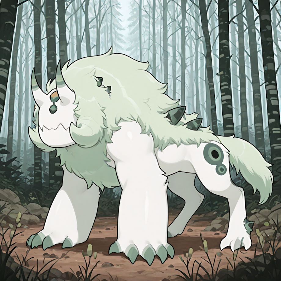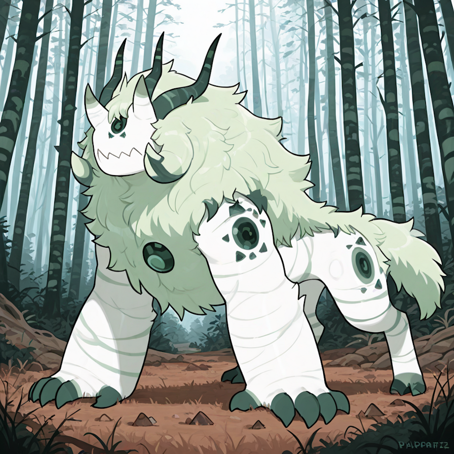 masterpiece, best quality, amazing quality, <lora:Corrupted_Quartz__Steven_Universe__Illustrious:1>, corrupted quartz, no eyes, no ears, no nose, birch forest, white skin, ((dark green stripes)), light green fur, chest gem, five horns