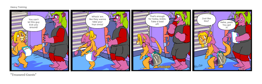 Illustration of Friar the wet and messy diapered lion as seen from behind his diaper on the changing table with his legs apart. "Trust me, my potty couldn't handle THAT."