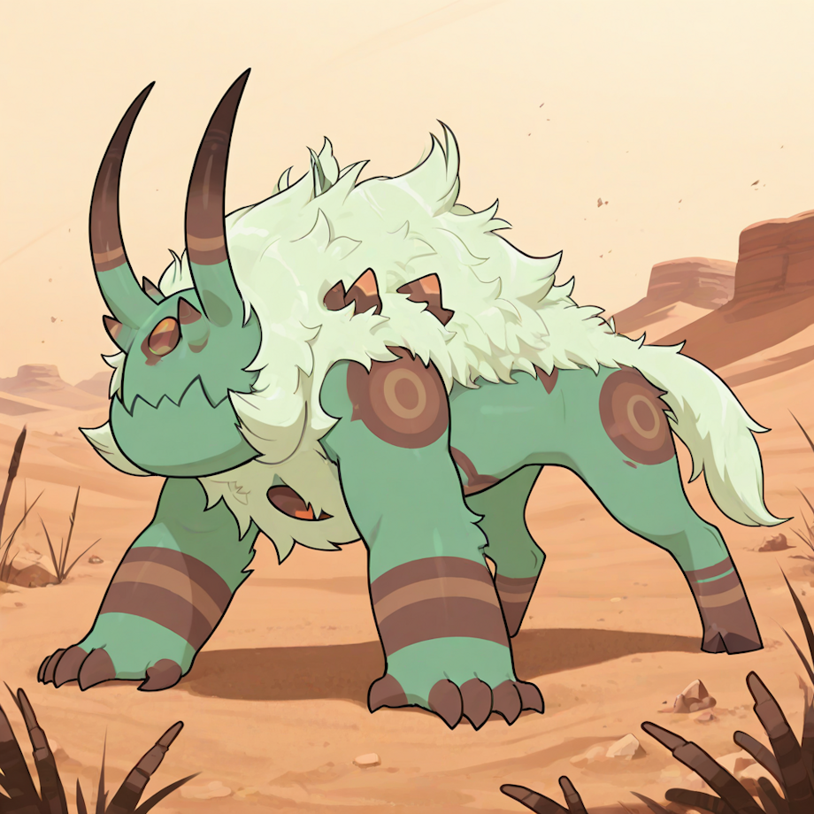 masterpiece, best quality, amazing quality, <lora:Corrupted_Quartz__Steven_Universe__Illustrious:1>, corrupted quartz, no eyes, no ears, no nose, desert, bright green skin, brown markings, light green fur, five horns, hip gem