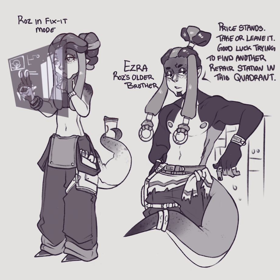 Made some sketches of Roz for when she's not out there in the void looking for rare and valuable treasures. On what is basically her day off, she likes to lounge in baggy [ often stolen ] shirts or crop tops combed with biker shorts or sweats. Whatever is comfy so she can pretty much spend the day sleeping.