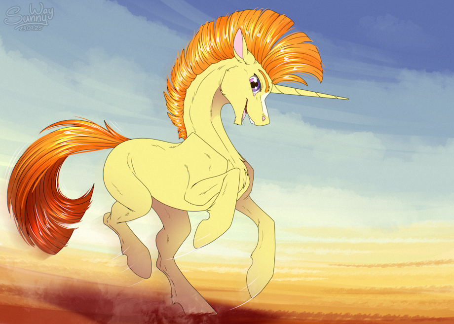 Sunspot looks so happy, like he's galloping through the savanna to meet... someone special! Maybe to his very special somepony ;3 As far as I know, this character is considered to be Sunburst's dad!