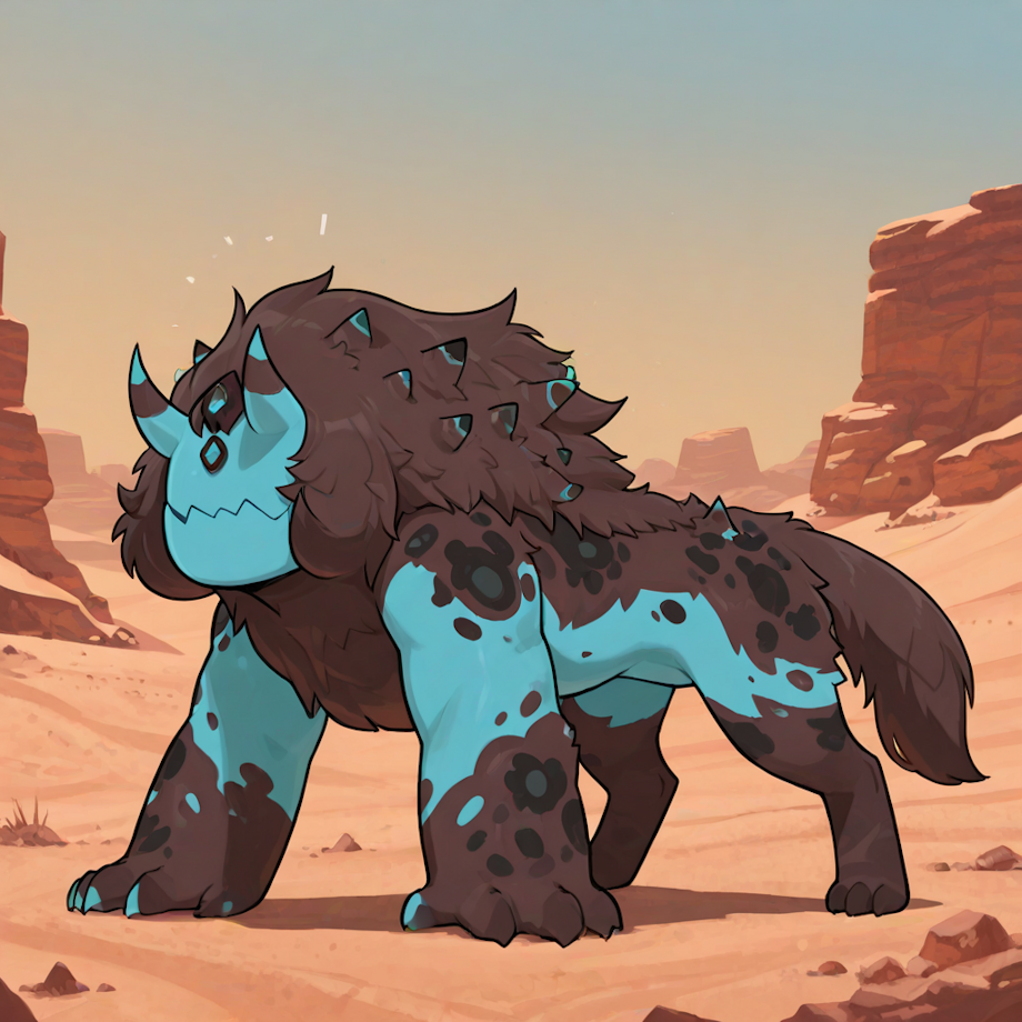 masterpiece, best quality, amazing quality, desert, bright blue skin, black spots, dark brown fur, <lora:Corrupted_Quartz__Steven_Universe__Illustrious:1>, corrupted quartz, no eyes, no ears, no nose, three horns, head gem