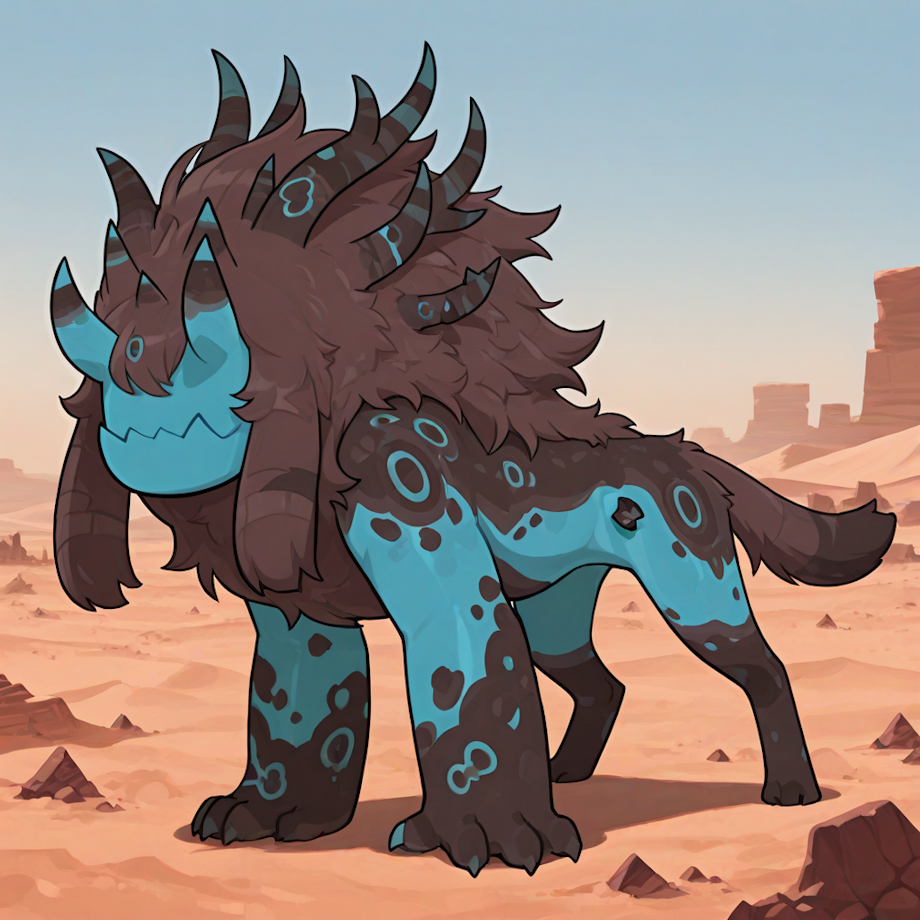 masterpiece, best quality, amazing quality, desert, bright blue skin, black spots, dark brown fur, <lora:Corrupted_Quartz__Steven_Universe__Illustrious:1>, corrupted quartz, no eyes, no ears, no nose, many horns, head gem, spikes, shoulder spikes