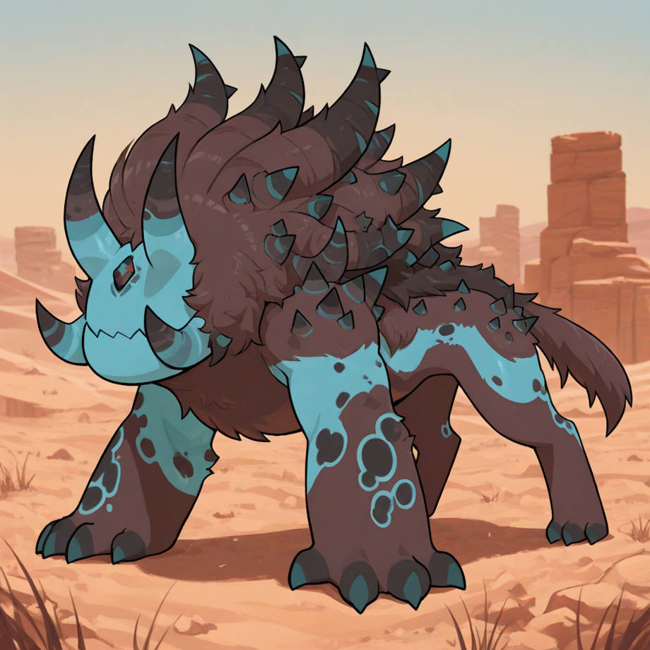 masterpiece, best quality, amazing quality, desert, bright blue skin, black spots, dark brown fur, <lora:Corrupted_Quartz__Steven_Universe__Illustrious:1>, corrupted quartz, no eyes, no ears, no nose, many horns, head gem, spikes, shoulder spikes
