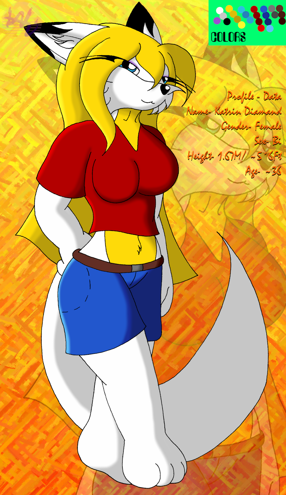 - Character Main Data Art Universe - Anum Chaos Name - Katrin, "Little K" FULL Name - Katrin Diamand Gender - female Sex - Bi Height - 1.67m /~5´6ft Age - ~36 Humanyears Race/Class - Vixen, Arctic Nature, Anum IF there would be a theme song - https://www.youtube.com/watch?v=HfgSbXzkXSQ