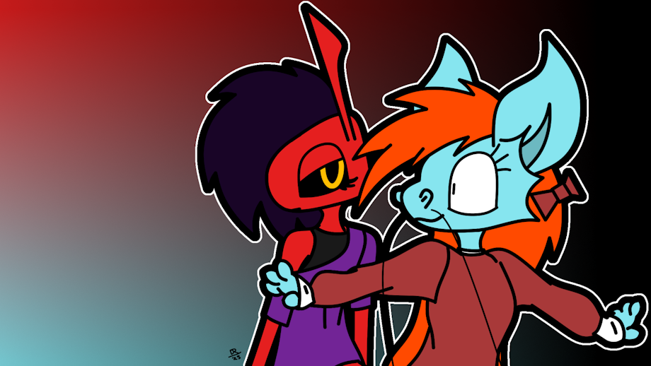 A desktop background of these adopted sisters, EmiEmi and Andromeda. EmiEmi the demon Lehl and Andromeda the blue dragon