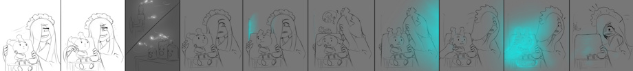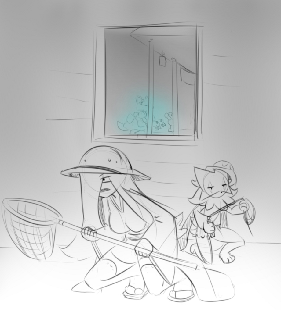 Hahahahaha oh no! The aliens really ARE coming! The Abra Maids are too clever, dang. Many fun faces from the conspiracy caretaker girl! I like the detail of the Meowscarada going to check on the light from the other room in the background.