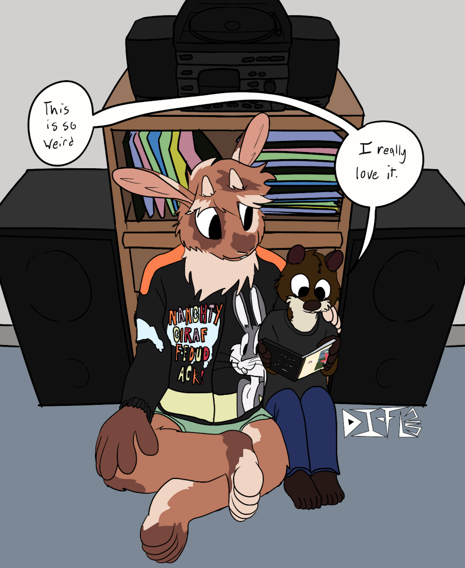 Reddish light brown rabbit wearing shorts and a bootleg bugs bunny jacket sitting next to a shorter otter wearing a black shirt and jeans, looking at a CD case. They are on the floor in front of a sound system on a shelf with two large speakers next to them. On the shelf behind the rabbit's head are a bunch of records.