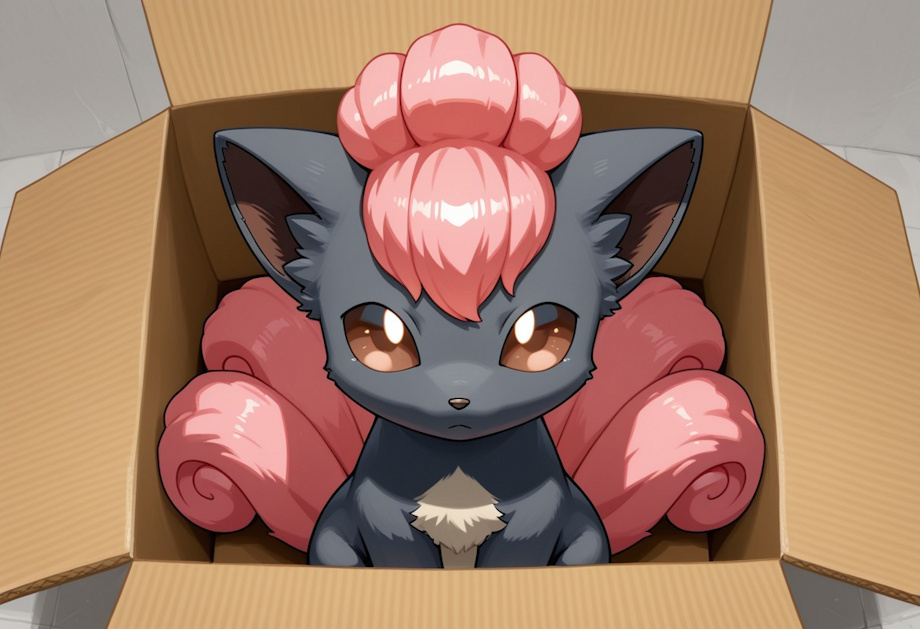 (This was done through civit ai, I will link the original. but I think this is all the info_ Model: https://civitai.com/models/1595884/hyphoria-illu-and-na... Male vulpix, black fur, pink tails, staring-at-viewer, sitting-in-cardboard-box Negative prompt: nsfw Steps: 34, baseModel: Illustrious, CFG scale: 5, Sampler: Heun, Seed: 2136240187, workflow: txt2img, Size: 1216x832, draft: false, width: 1216, height: 832, quantity: 4, disablePoi: true, aspectRatio: 19:13, Created Date: 2026-01-18T2142:04.8718243Z, outputFormat: jpeg, Clip skip: 2)