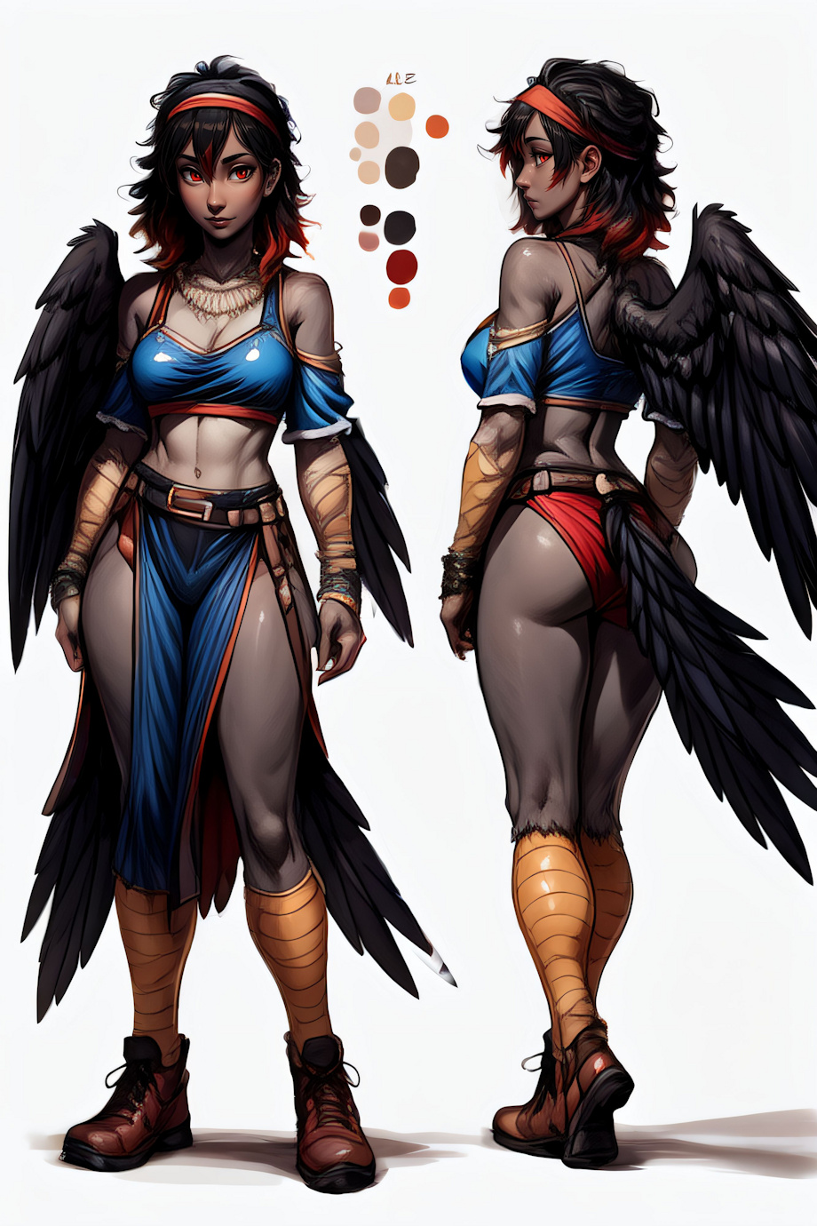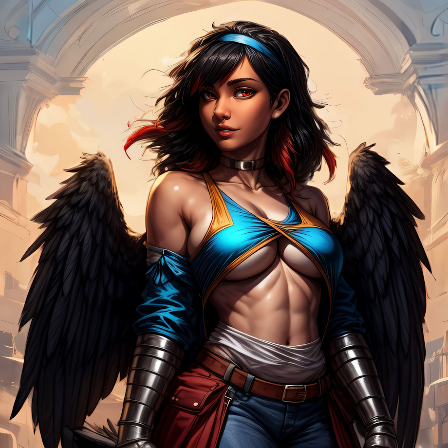 masterpiece, best quality, <lora:(1) Furtastic Detailer:1> (solo:1.4) BREAK <c1rc3> (AS-Adult:1.3) A (female:1.3) (angel:1.3) with a (slender:1) (medium breasts:1.4) (gray skin:1.4) (athletic body:1), (black feathers:1.5) (black scuted arms:1.4) (red eyes black pupils:1.4) (slit pupils:1.4) (back wings:1.4) (stray bangs:1.4) (shoulder length hair:1.3) (black hair:1.4) (red highlights:1.4) (avian legs:1.4) (white belly:1.3) (humanoid face:1.4) (janetbefore:1.3) (black tail feathers:1.4) (feathered wings:1.4) (human ears:1.5) (blue headband:1.4) (countershade legs:1.4) <lora:CharacterDesign_Concept:0.6> (CharacterSheet:1), (multiple views, full body, upper body, reference sheet:1),, (clothes:2) Negative prompt: bloodshot eyes, arms behind back, hands behind back, blurry, blurry background, bad anatomy, bad hands, three hands, three legs, bad arms, missing legs, missing arms, poorly drawn face, bad face, fused face, cloned face, worst face, three crus, extra crus, fused crus, worst feet, three feet, fused feet, fused thigh, three thigh, fused thigh, extra thigh, worst thigh, missing fingers, extra fingers, ugly fingers, long fingers, horn, realistic photo, extra eyes, huge eyes, 2girl, amputation, disconnected limbs, worst quality, normal quality, low quality, low res, blurry, text, watermark, logo, banner, extra digits, cropped, jpeg artifacts, signature, username, error, sketch ,duplicate, ugly, monochrome, horror, geometry, mutation, disgusting, jpeg artifacts, bad quality, jpg artifacts,badhandv4, easynegative boring_e621_v4, boring_e621_v4, bad quality, worst quality,, (nipples, nude, nudity:2) (erect nipples:2) (topless:2) Steps: 35, Sampler: Euler a, CFG scale: 7.5, Seed: 2903756147, Size: 512x768, Model hash: 8e2f4f1346, Model: yiffymix_v44, VAE hash: 24e650297c, VAE: furception_vae_1-0.safetensors, Denoising strength: 0.01, CFG Rescale: 0.7, ADetailer model: person_yolov8s-seg.pt, ADetailer confidence: 0.3, ADetailer dilate erode: 4, ADetailer mask blur: 4, ADetailer denoising strength: 0.4, ADetailer inpaint only masked: True, ADetailer inpaint padding: 32, ADetailer model 2nd: face_yolov8s.pt, ADetailer confidence 2nd: 0.3, ADetailer dilate erode 2nd: 4, ADetailer mask blur 2nd: 4, ADetailer denoising strength 2nd: 0.4, ADetailer inpaint only masked 2nd: True, ADetailer inpaint padding 2nd: 32, ADetailer version: 24.11.1, Hires upscale: 1.5, Hires steps: 20, Hires upscaler: 4xUltrasharp_4xUltrasharpV10.pth, Lora hashes: "(1) Furtastic Detailer: 2e94914f676c, CharacterDesign_Concept: 6f65857a23ad", TI hashes: "AS-Adult: 5d558ec2fb1e, janetbefore: 72fbcacc9b35", Version: v1.6.0 |