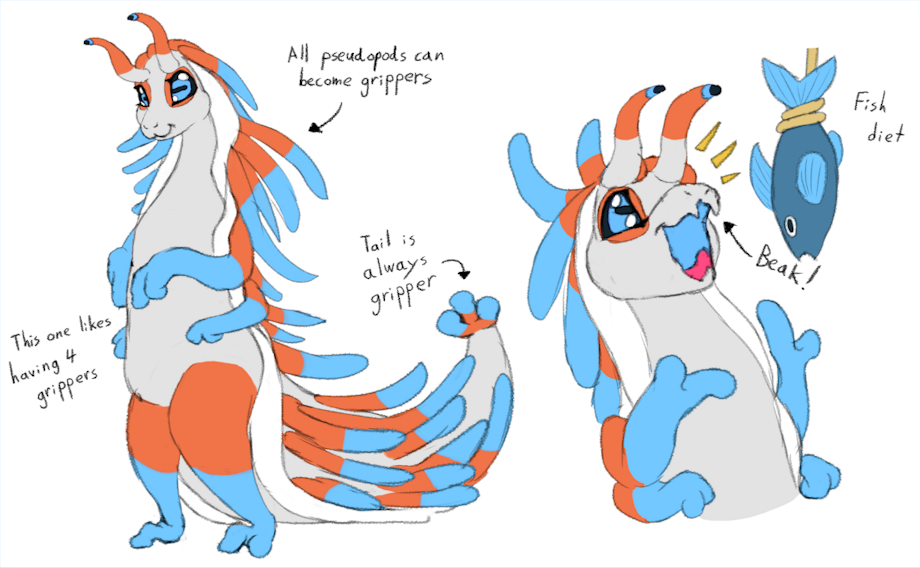 Molluskomorphs. An amphibious, slug-like creature. Big enough to bridal-carry you, skin smooth as velvet, generally approachable when fed fish. Be sure to firmly rub the belly, because an overly soft touch is just ticklish!