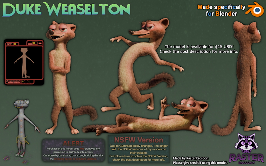 At the time of me typing this, Gumroad has banned all NSFW content. As a result, I must use a roundabout way of providing NSFW versions. 🔞HOW TO OBTAIN NSFW VERSION🔞 1. First, you must buy the model from Gumroad. 2. Then, email rockyrcoon3D@gmail.com, asking for the NSFW version. Use the same email you did on Gumroad, so I can confirm your purchase. 3. Once I confirm via your email that you bought the model(s), I will grant access to the NSFW version. 4. If you primarily use an alternative to gmail, I will also need a gmail address in order to grant you access via google drive. Please be patient in case I'm asleep or otherwise unavailable. If I take a while to respond, feel free to contact me via Discord.