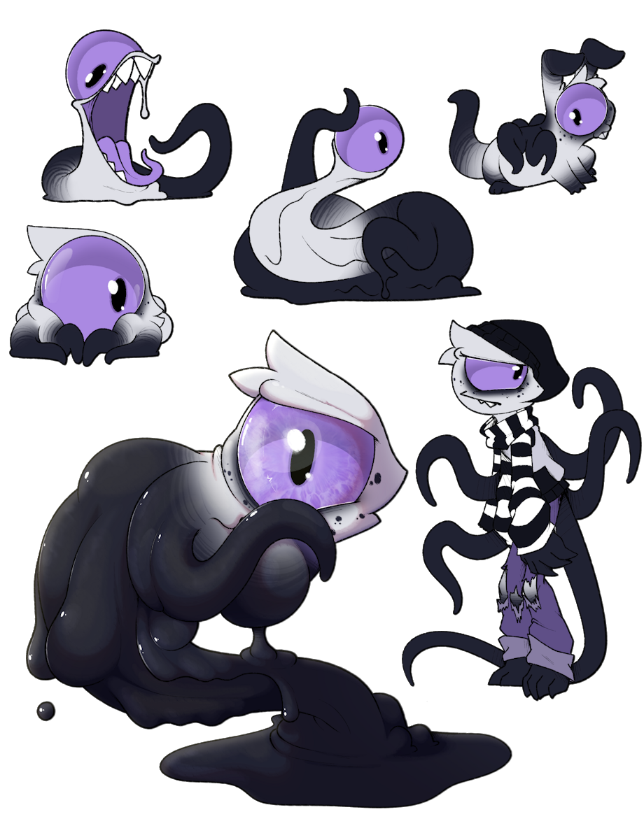 Syk is an amorphous slime with the ability to transform into whatever form they want. As long as the eye remains intact. I did some doodles to show off some different forms they can take on