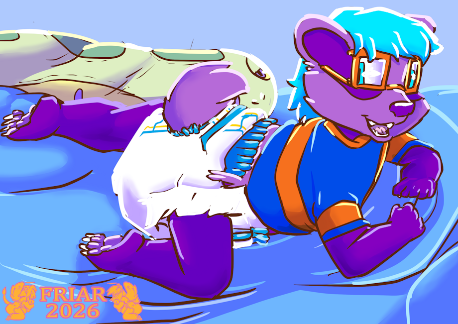 Illustration of Everett the wet and messy diapered badger on his tummy by his snake plushie extending a leggy while looking at the viewer. "Boy am I pooped. Pooped in my diaper!"