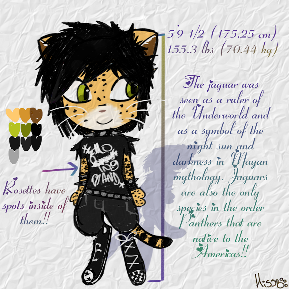 Valentine likes to have his hair spiky and somewhat long. His hair is naturally black as well. He has amber colored fur, with spotty black rosettes all over. He has a patch of white fur on his face, and the insides of his arms.