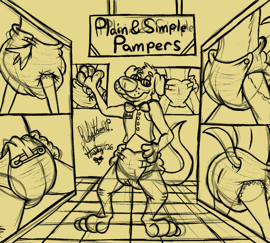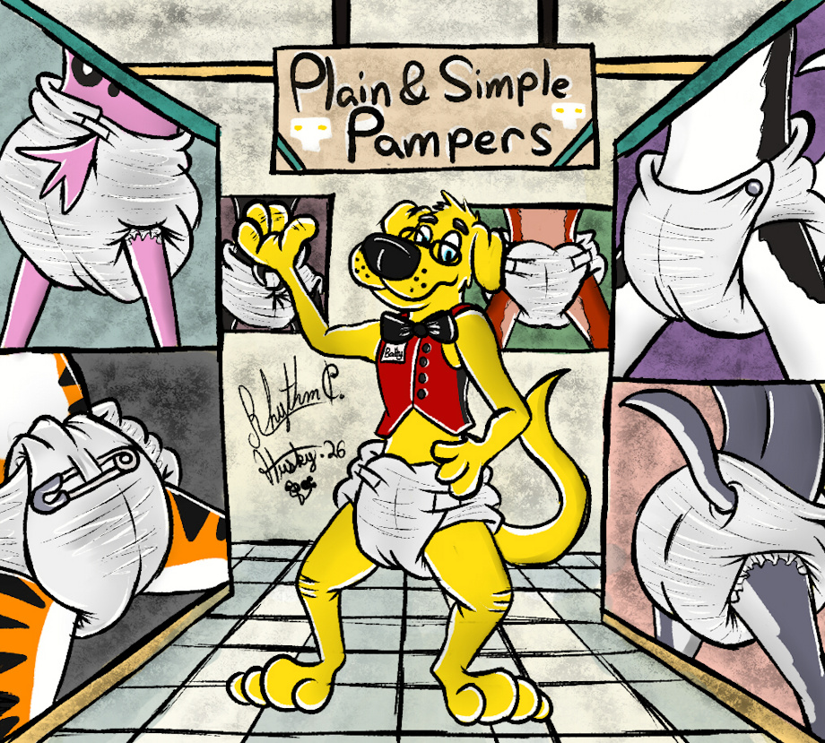 Here is Ballythedog one of the museum guides taking you through one of his most favoritest galleries of all time, called the Plain and Simple Pampers Gallery. And as the name implies it displays pctures of furries wearing plain white diapers in both cloth and disposable diapers. and this section has not only pictures but also diaper stone figures, glass and clay diaper art sculptures in glass display cases, and even samples too.