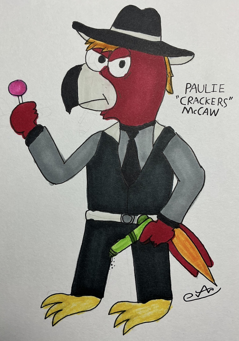 He's a red parrot inspired by the gangsters of New York from the 1930s, specifically the gangsters in the film Oscar from 1991.