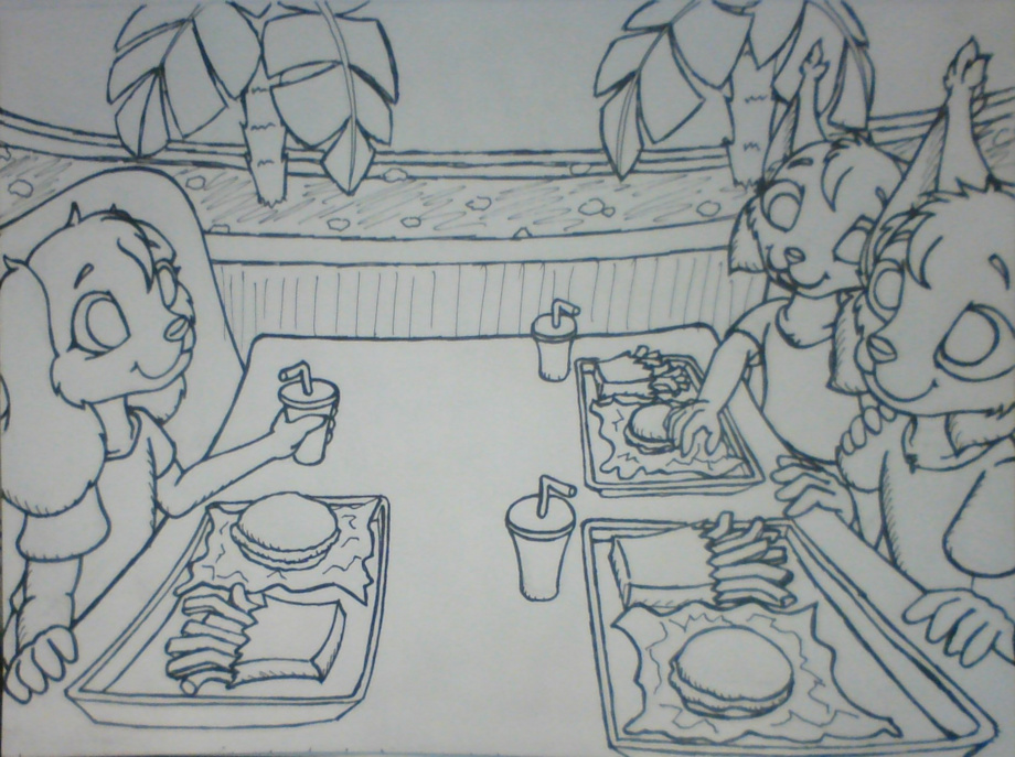 Amy stealing a fry from her brother, although she has a full pouch of her own!