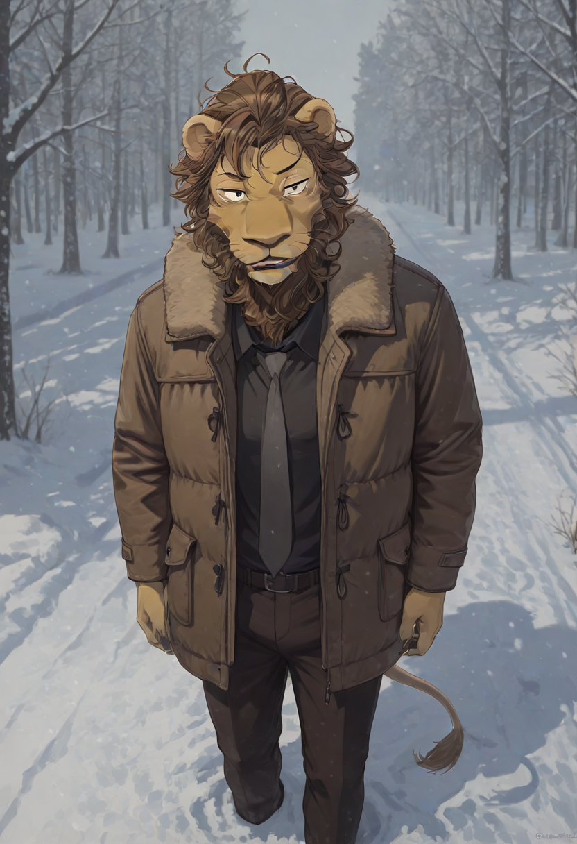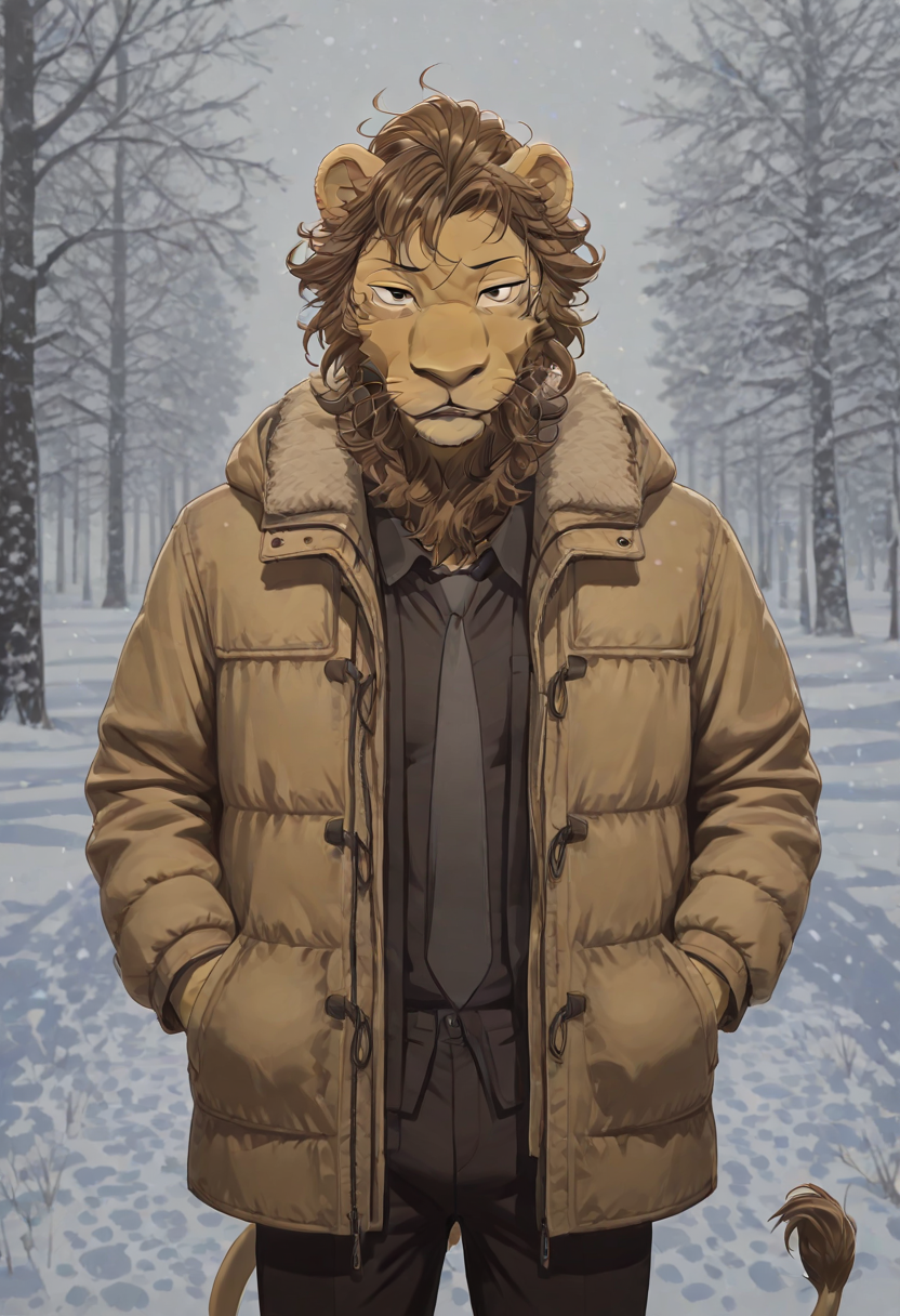 masterpiece, best quality, amazing quality, <lora:Agata:1> anthro, furry, (beastars) lion boy, lion, lion ears, lion snout, multi-colored fur, yellow fur, brown hair, black pupils, black whiskers, lion tail, big brown spots on his face, slightly wavy mane, lion mane, mane, facial mane, big brown spots, winter theme, snow, puffy coat, pants