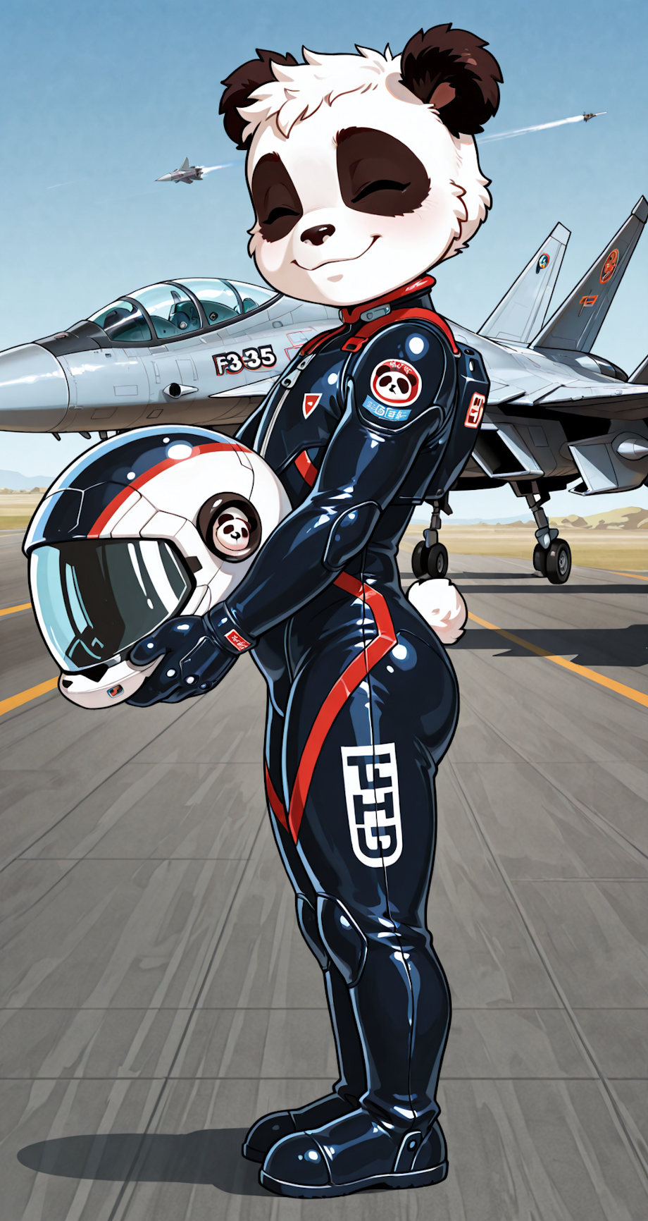 alone, young, teen, male, shortstack petite, small body proportions, panda, facing viewer, in a jet fighter pilot suit, holding one helmet, standing in front of F-35 jet on a runway, side view of jet