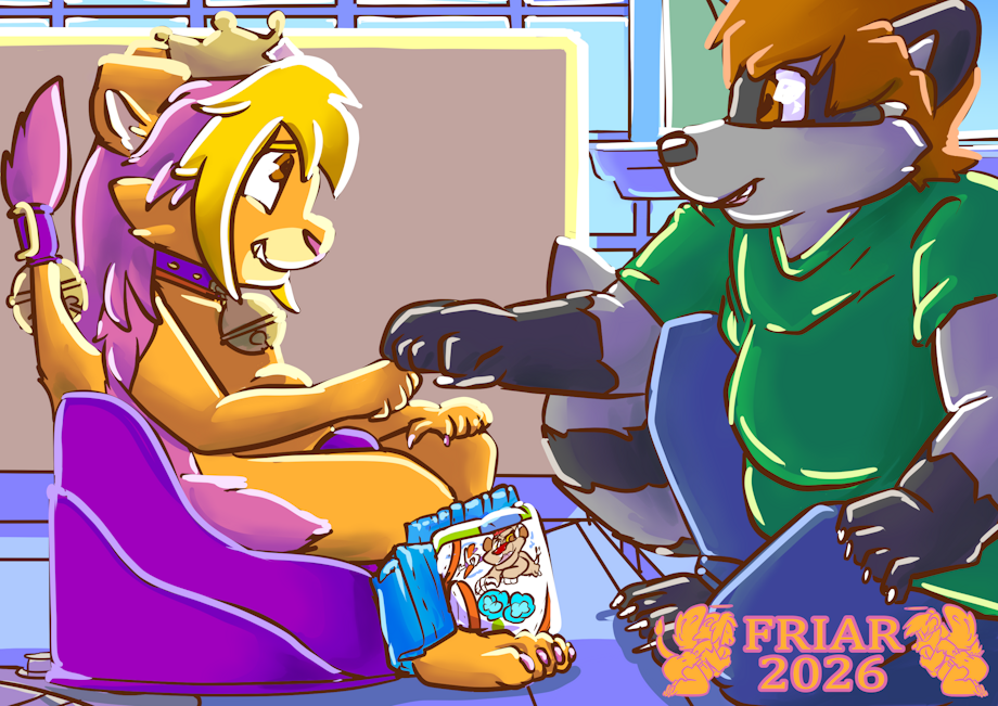 Illustration of Friar the lion in pullups peeing in his training potty while Daddy Tylahn the raccoon gives him a fist bump. "May we have our diapers back?" "You've got it, your majesty."