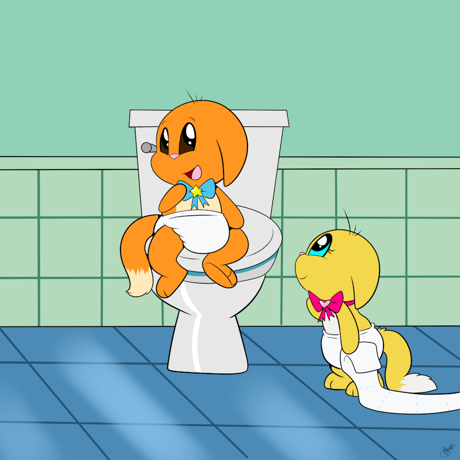 Tangerino sits on the potty lid thinking it's a seat as Lemina watches curiously