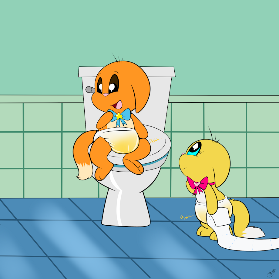 Tangerino sits on the potty lid thinking it's a seat as Lemina watches curiously