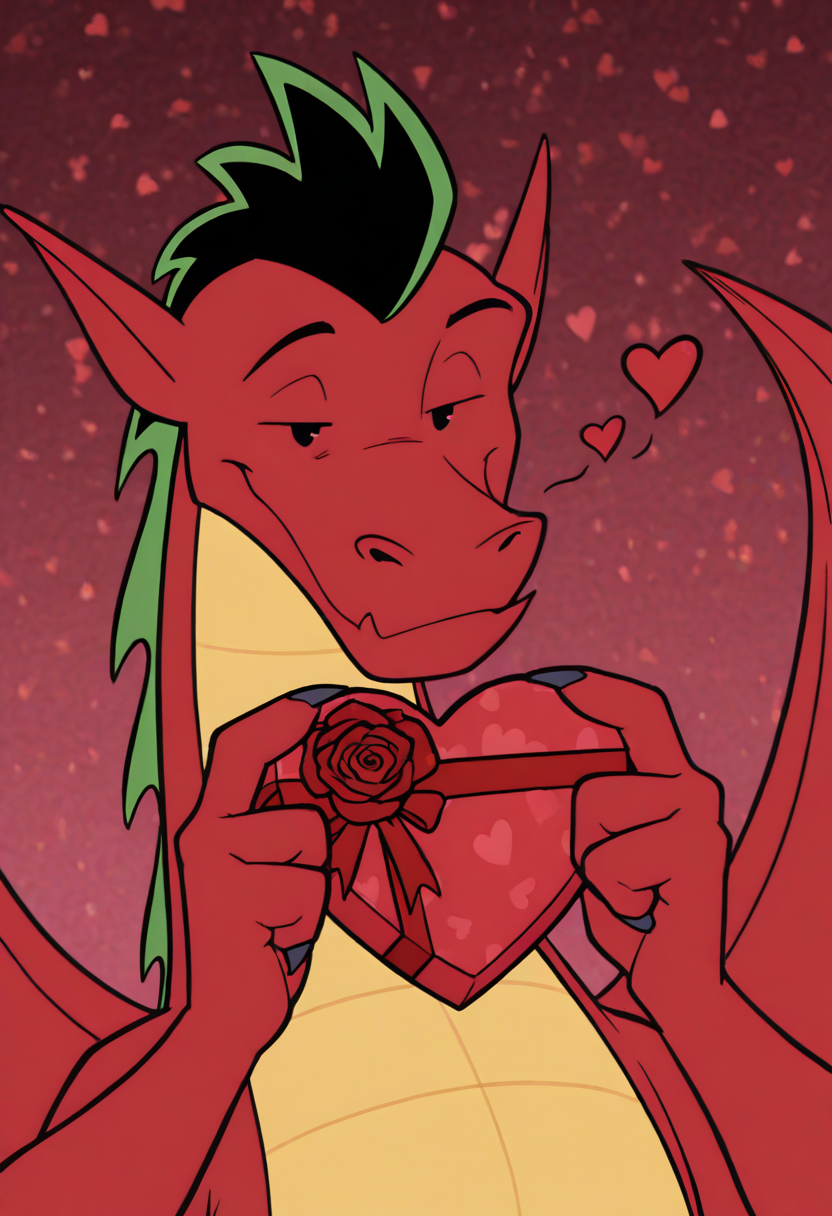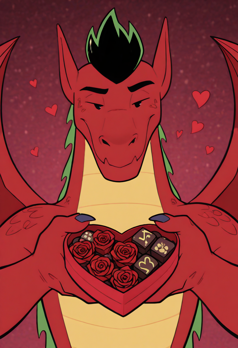 masterpiece, best quality, amazing quality, valentine's day theme, heart-shaped box of chocolates, rose, <lora:American_Dragon:1> j4k3, dragon boy, black eyes, ((solo))