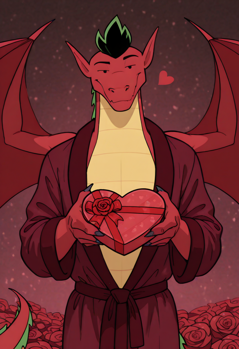 masterpiece, best quality, amazing quality, valentine's day theme, heart-shaped box of chocolates, rose, <lora:American_Dragon:1> j4k3, dragon boy, black eyes, ((solo)), dark red bathrobe
