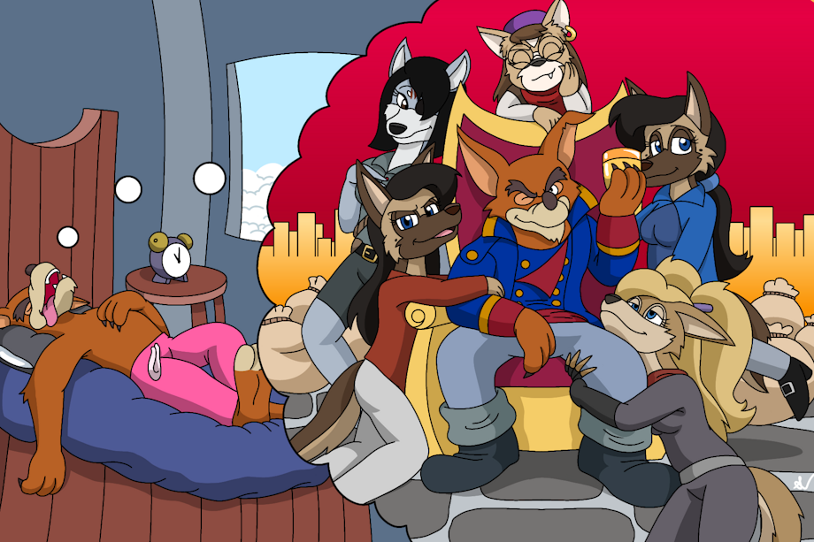 Here, we have Don Karnage dreaming one of his favorite dreams: being the wealthiest man in the world, and with his own private harem of beautiful air pirate women (owned by yours truly).