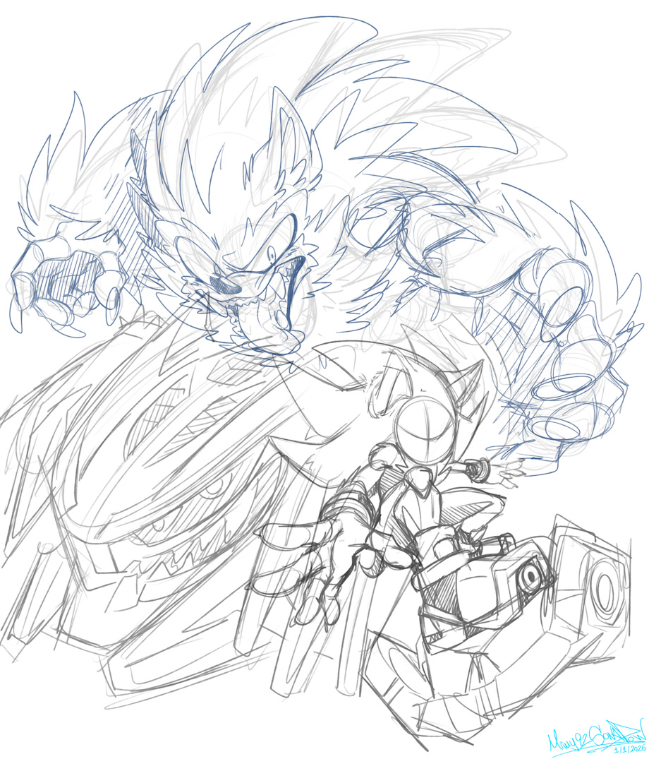 Haha, I've been working on this drawing since the end of October, and finally, as a "New Year's gift," I've decided to finish it, and I'm really happy about it. I think I abandoned it because I wasn't convinced about Sonic Werehog's face, and I didn't know how to finish the image, like everything related to effects and the background. Well, a couple of days ago I picked it up again. I was inspired by the amazing Sonic Crossworlds promo video (https://www.youtube.com/watch?v=5ocBa8jTXUA ), and it helped me a lot with the effects (thanks, Photoshop, for the Gaussian blur, haha!). So, I'm happy to start 2026 with more art by and for myself, and I'm so happy to share it with all of you ^^