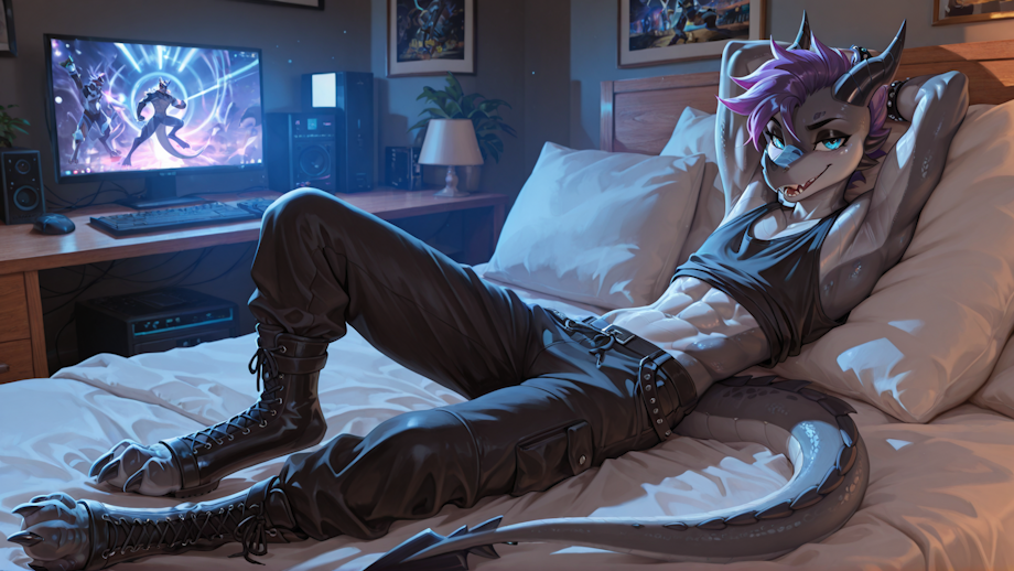 small dark grey and silver anthro dragon, scalie, (silver skin), male, tail, short punk hair, royal purple hair, blue eyes, black horns, sharp teeth, sharp claws, teen, ((no ears)), ((abs, detailed abs, sixpack abs, powerful arms, muscular, ultra detailed muscles)), black eyeliner, black eyeshadow, expressive face, (digitigrade legs:1.5), flat chest,
