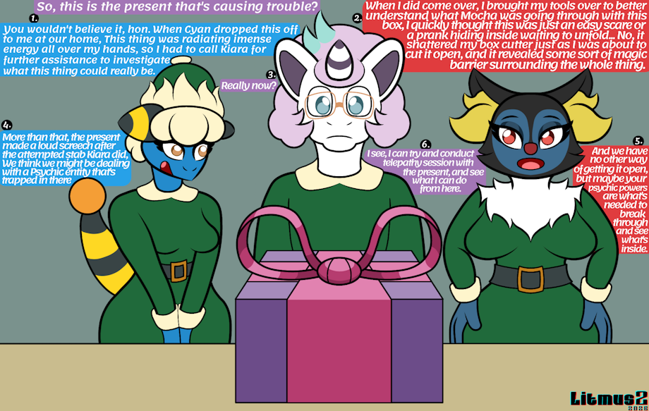 A few hours after the first attempt to open the mystery gift, Mocha's boyfriend Sparkle comes back home from the cafe, where he is then informed by the girls about the bizarre situation they're experiencing. With a psychic type now present, Sparkle would use the knowledge about the potential "magical entity" inside the box, to conduct a telepathy session with it before continuing with the process- a simple task turned daunting the more it continued... He came out sweating and deprived from a dark, airless room, with a damned soul trapped in there. While he wasn't able to communicate with the entity, he did gain some foresight from it that would better understand what the Mystery Gift is. Sparkle would position himself in front of the item, charge up his unicorn horn, channel an appropriate spell into the attack, and fired a Psybeam directly at the magic barrier, shattering it into pieces. The mystery gift, now demagnetized of its magic, and heavily torn up on all sides, is about to undergo an explosive fate that the trio have earned front row seats to witness...