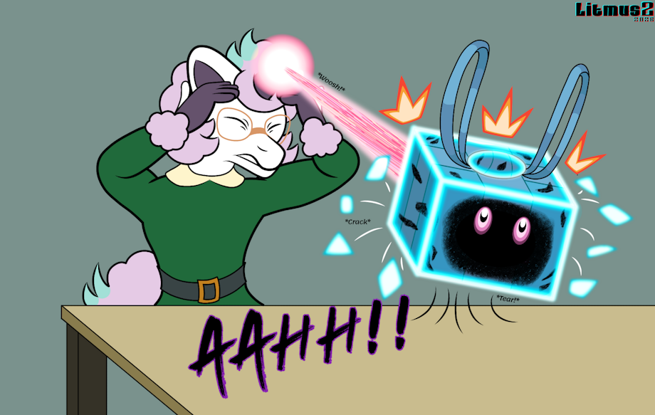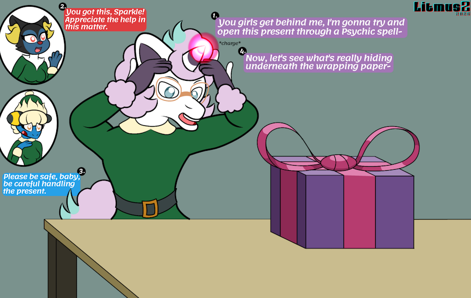 A few hours after the first attempt to open the mystery gift, Mocha's boyfriend Sparkle comes back home from the cafe, where he is then informed by the girls about the bizarre situation they're experiencing. With a psychic type now present, Sparkle would use the knowledge about the potential "magical entity" inside the box, to conduct a telepathy session with it before continuing with the process- a simple task turned daunting the more it continued... He came out sweating and deprived from a dark, airless room, with a damned soul trapped in there. While he wasn't able to communicate with the entity, he did gain some foresight from it that would better understand what the Mystery Gift is. Sparkle would position himself in front of the item, charge up his unicorn horn, channel an appropriate spell into the attack, and fired a Psybeam directly at the magic barrier, shattering it into pieces. The mystery gift, now demagnetized of its magic, and heavily torn up on all sides, is about to undergo an explosive fate that the trio have earned front row seats to witness...