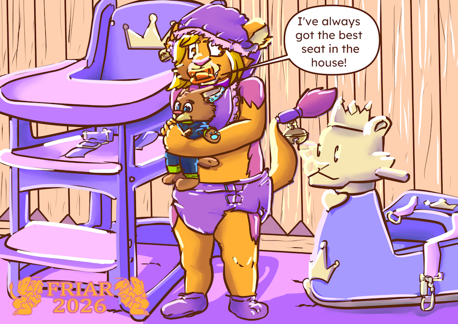 Illustration of Friar the wet and messy diapered lion hugging a Patches plushie while standing between a purple high chair and a gold and lavender belted lion training potty, the prince john. Friar is dressed in a bonnet and bib and a bell tail toy. "I've always got the best seat in the house!"