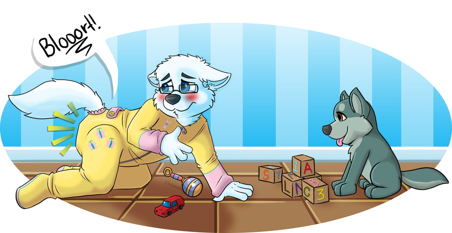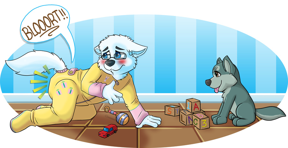 Wearing a fashionable Fluttershy-themed sleeper, and the plushie is of course Gin / Silver from the anime Ginga Nagareboshi Gin / Silver Fang.