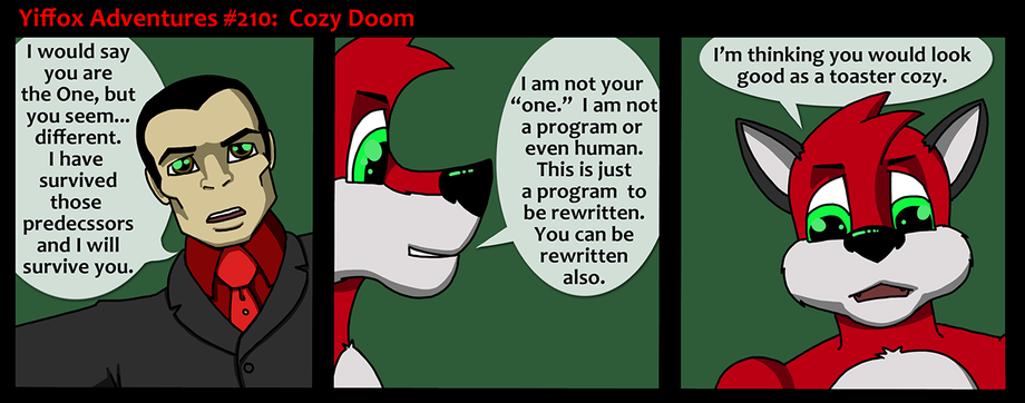 Heh, so go see Yiffox's adventures (in the Matrix currently) on muh site and vote to see the new Dawgrule Comic please ...new ones Wed, so current Dawgrule will disappear! And New Yiffsticks on Friday so vote then too http://yiffox.com/yiffadven/