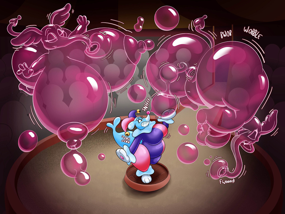 Come to the circus, Vivian's pink bubble elephant tricks are second to none. Watch in amazement as she inflates that bubble rump to the size of you! Gaze in astonishment as the wacky cartoon antics of our favorite seal clown. She's truly a sight to behold