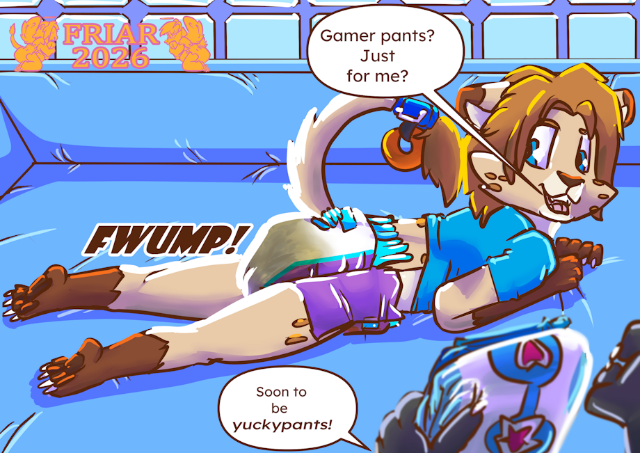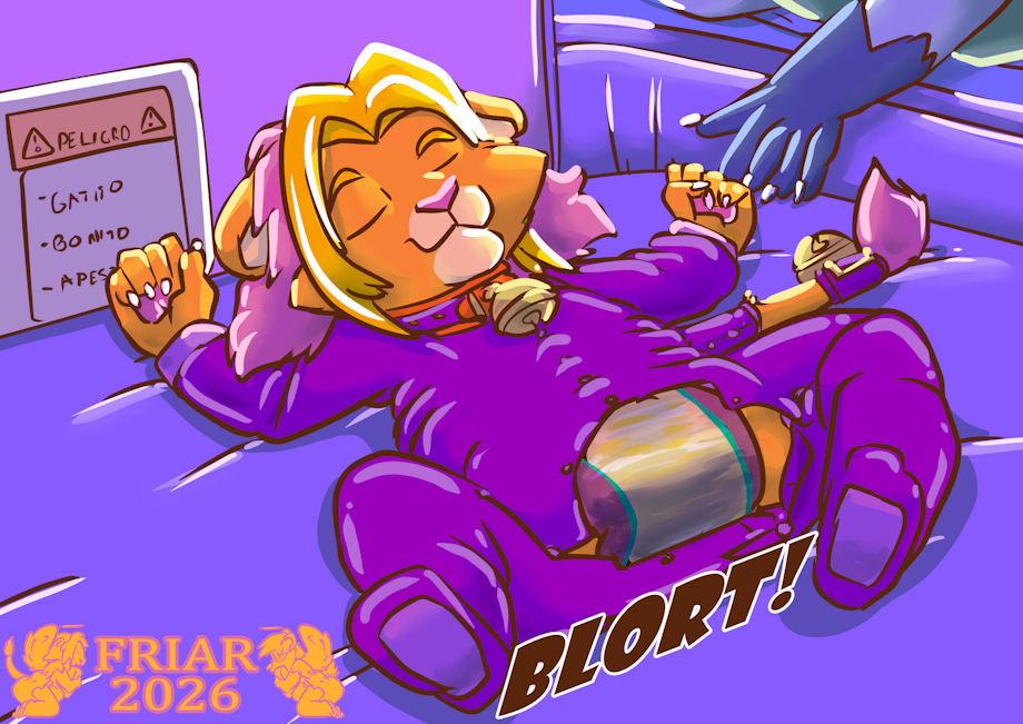 Illustration of Everett the wet and messy diapered badger crouched down and filling his diaper behind the couch where Daddy Tylahn is seated. "Here's the best spot to make big poopies!"