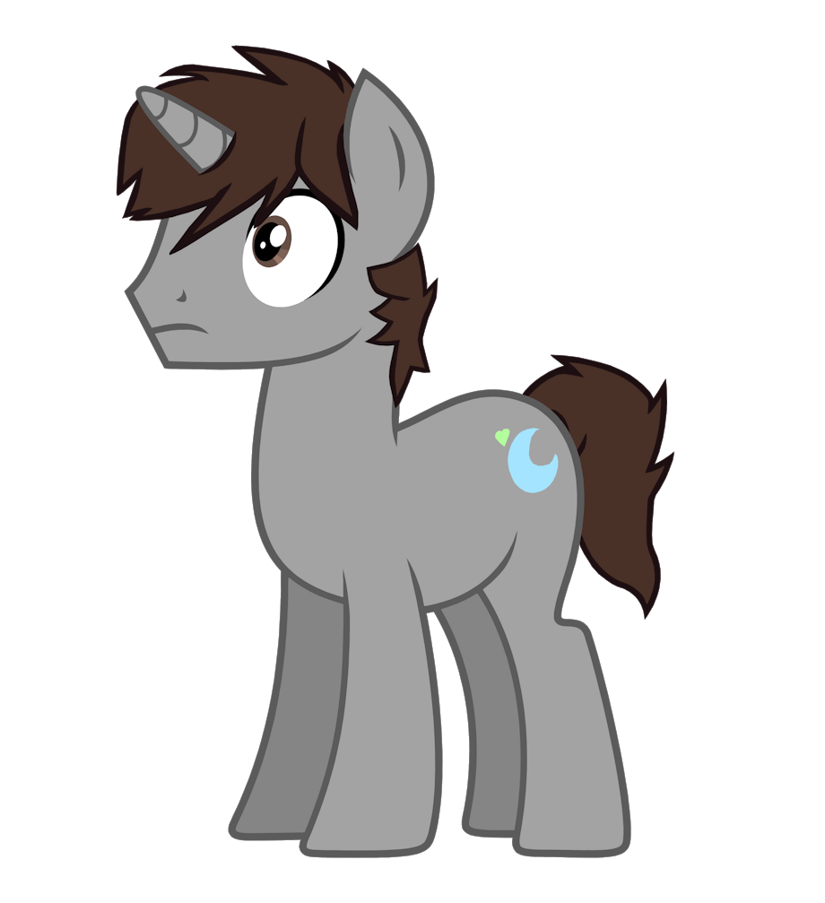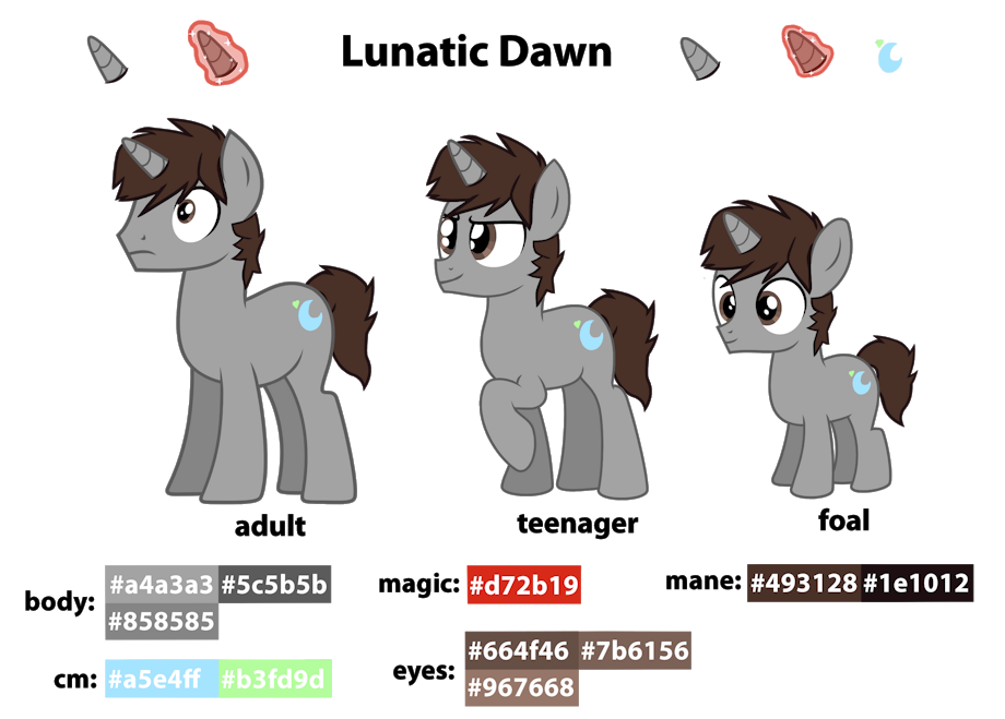 So, let's talk about his appearance. I was long debating whether to make him an earth pony or a unicorn (making him a pegasus was the last option and I hate editing wings), so I went with unicorn cuz unicorns are cool enough. His mane is dark brown just like my hair, same for his eyes and his coat is grey just like my life... lol. His magic aura is red because I like red color. His cutie mark represents my previous avatar I had for the longest of time - a smiling blue moon with a small bouncing heart next to it. Originally, I planned a different mark but nothing else came to mind. But I think it's fitting enough, so I'm glad in the end. And yes, I made him in three forms. I like the teenage version the most, honestly.