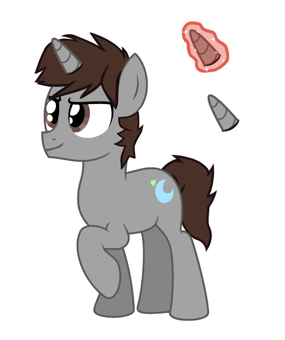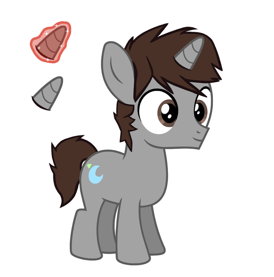 So, let's talk about his appearance. I was long debating whether to make him an earth pony or a unicorn (making him a pegasus was the last option and I hate editing wings), so I went with unicorn cuz unicorns are cool enough. His mane is dark brown just like my hair, same for his eyes and his coat is grey just like my life... lol. His magic aura is red because I like red color. His cutie mark represents my previous avatar I had for the longest of time - a smiling blue moon with a small bouncing heart next to it. Originally, I planned a different mark but nothing else came to mind. But I think it's fitting enough, so I'm glad in the end. And yes, I made him in three forms. I like the teenage version the most, honestly.